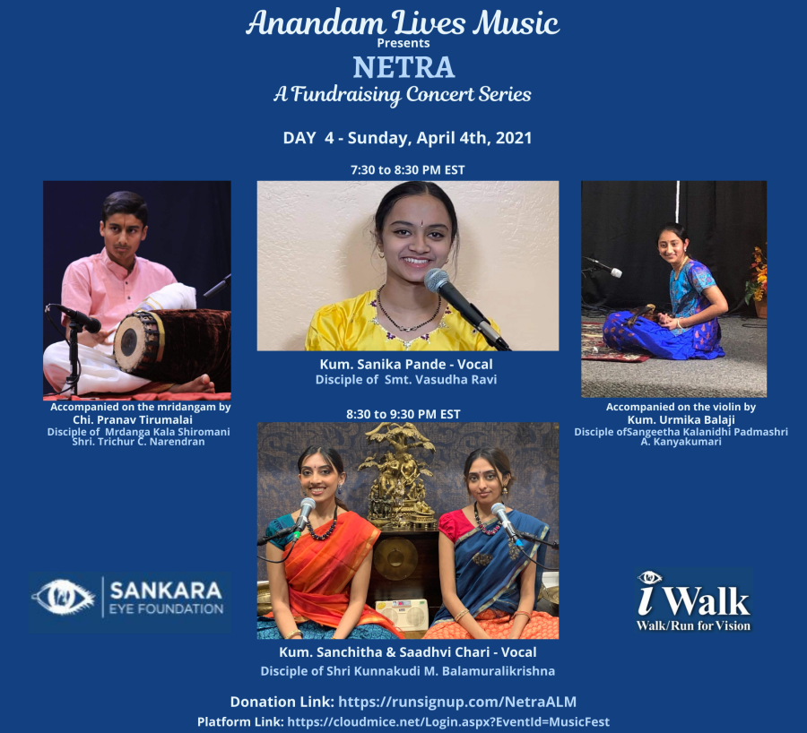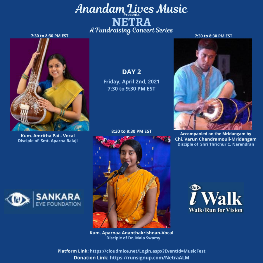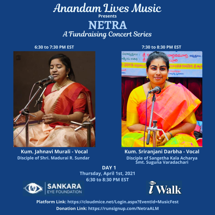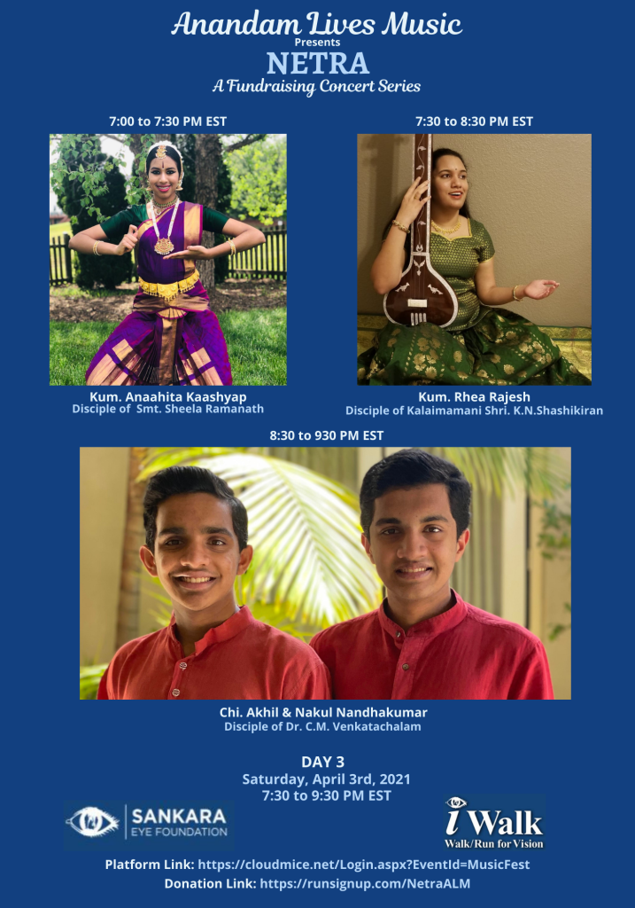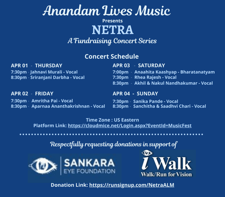 Sankara Eye Foundation (SEF) is the Global Leader providing FREE Eye Care Services. Having learned about SEF and its eye-opening work, we, Anandam Lives Music, decided to produce a boutique concert series with 14 artists dedicated to spreading the voice of SEF and creating awareness of the transformational impact of the Gift of Vision provided to over 2,200,000 patients. Thus came into being our NETRA Concert, Anandam Lives Music’s humble offering to raise awareness of the life-changing work by SEF, while simultaneously raising funds for continuing this service towards total eradication of curable blindness as soon as possible. We have 8 vocal concerts and 1 Bharatanatyam recital.